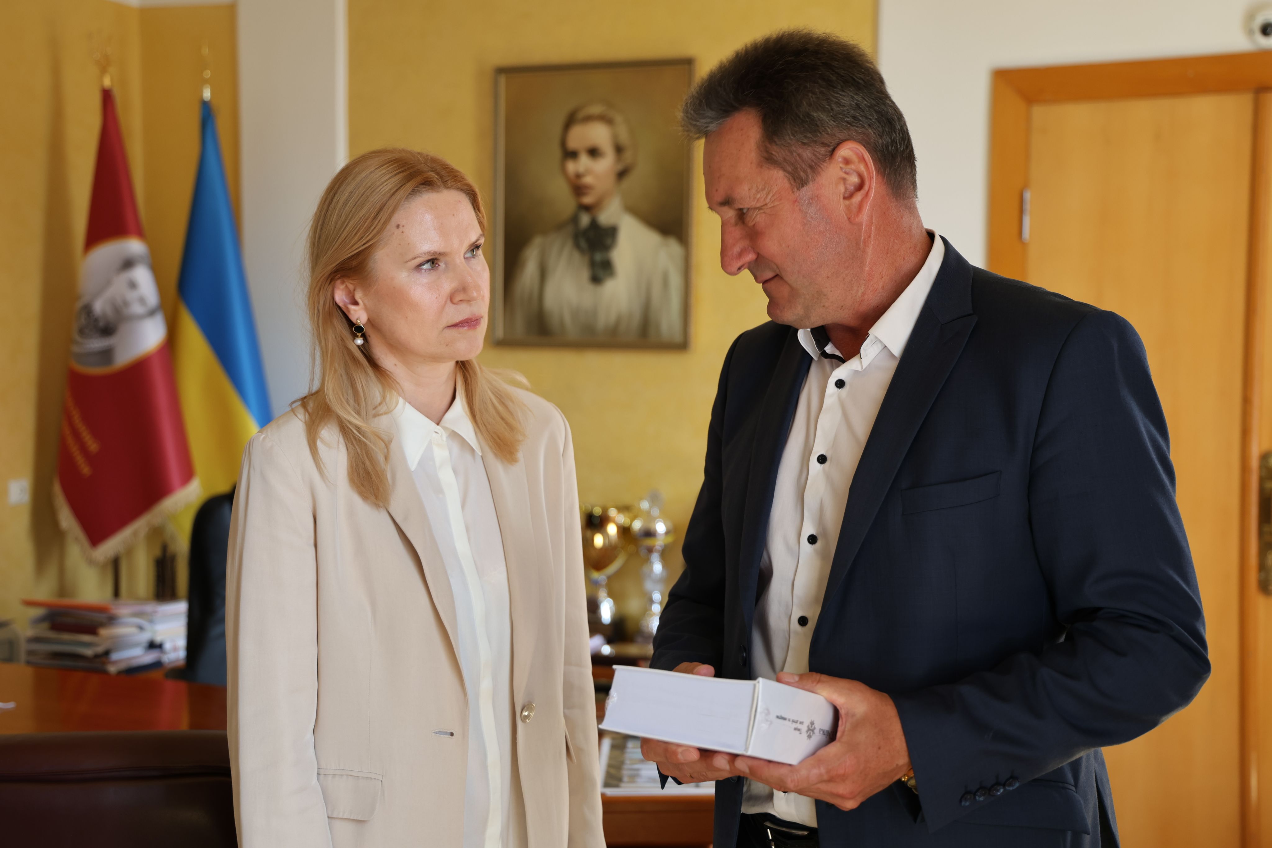 She met with Rector Anatolii Tsos who spoke about the achievements and achievements of the University, in particular, presenting the Complete Works of Lesya Ukrainka in 14 volumes and the 12-volume Collection of Works of Olena Pchilka.