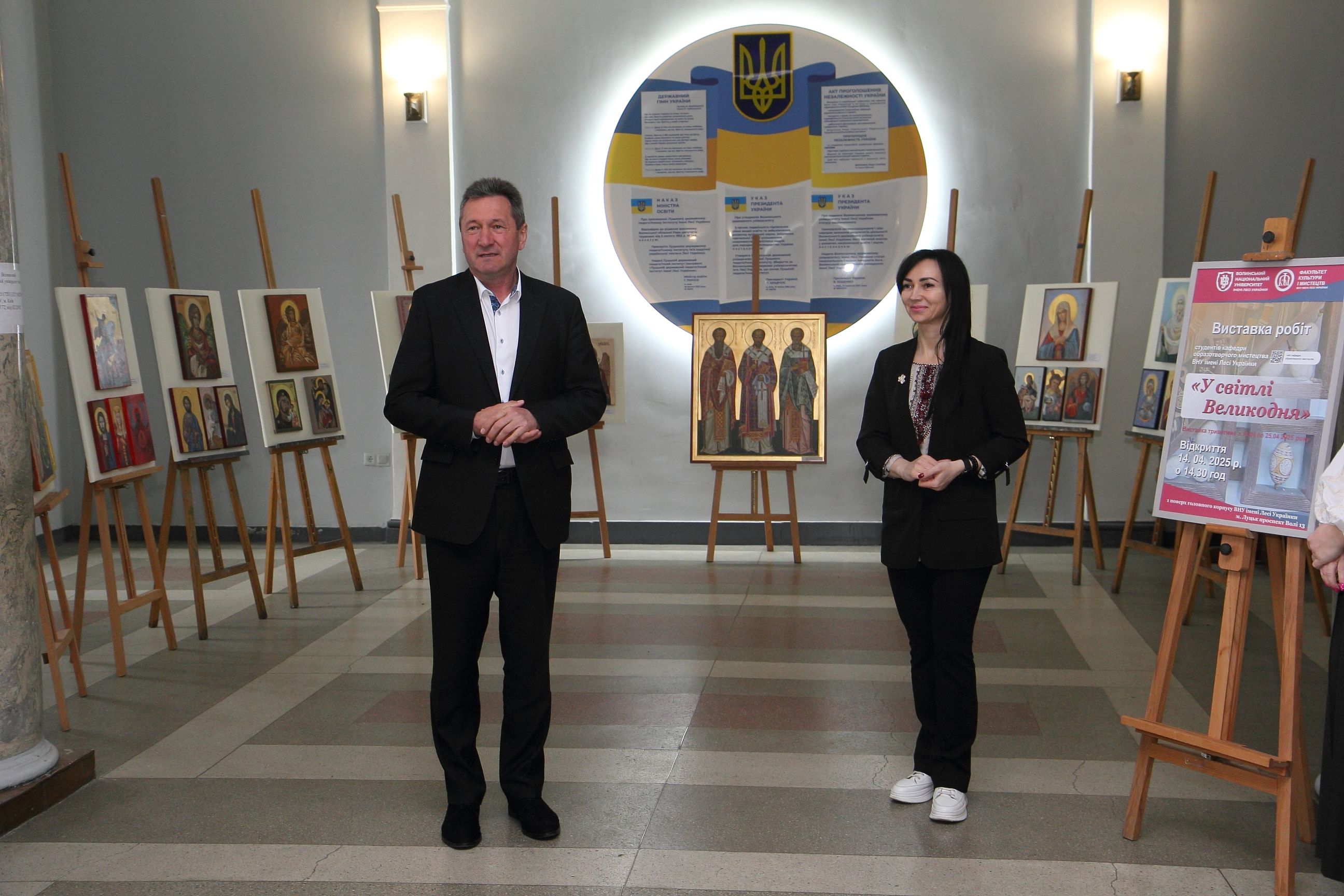 On April 14, 2025, the “In the Light of Easter” unique exhibition of works by the students of Department of Fine Arts of Faculty of Culture and Arts was opened in the hall of the main building of Lesya Ukrainka National University.