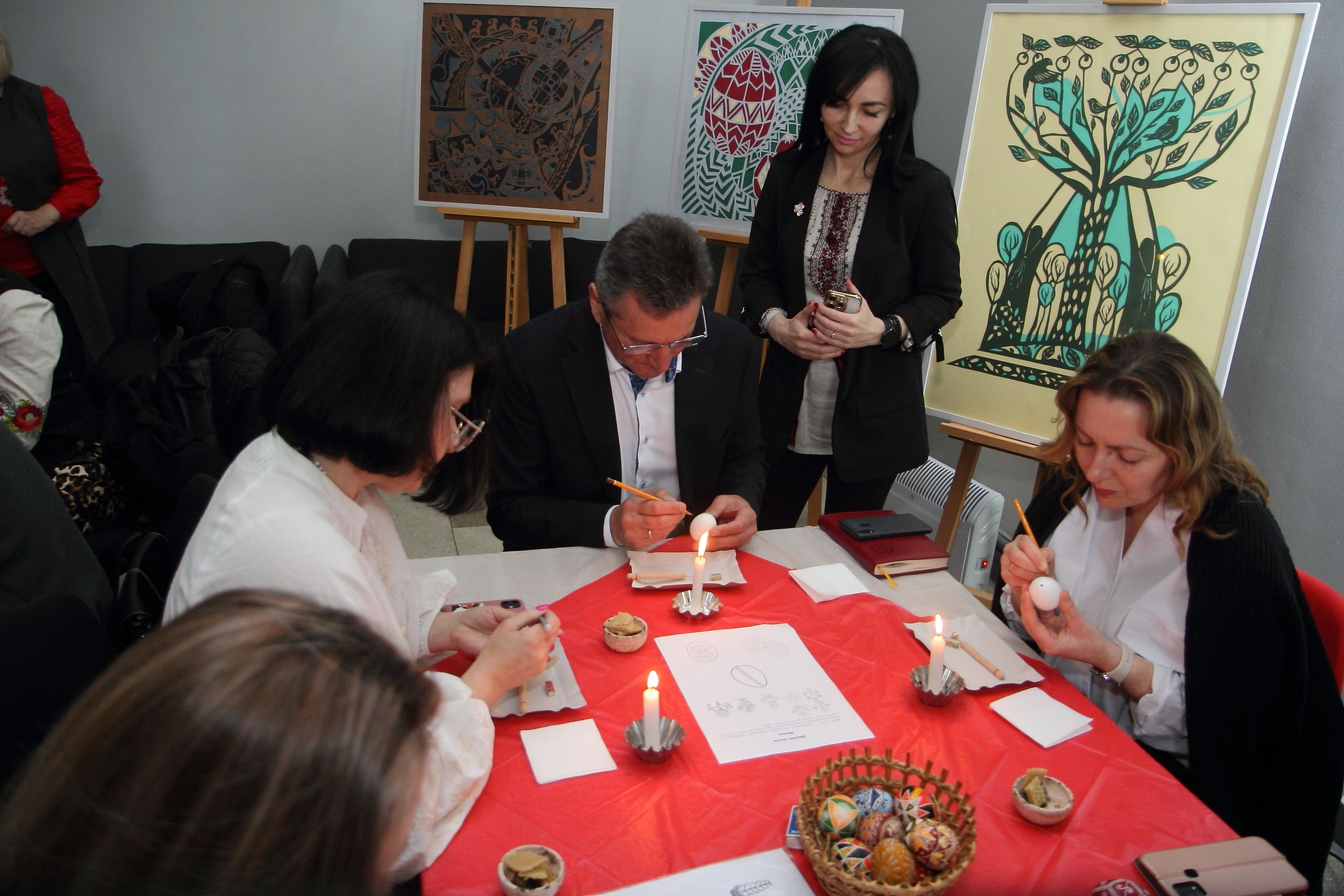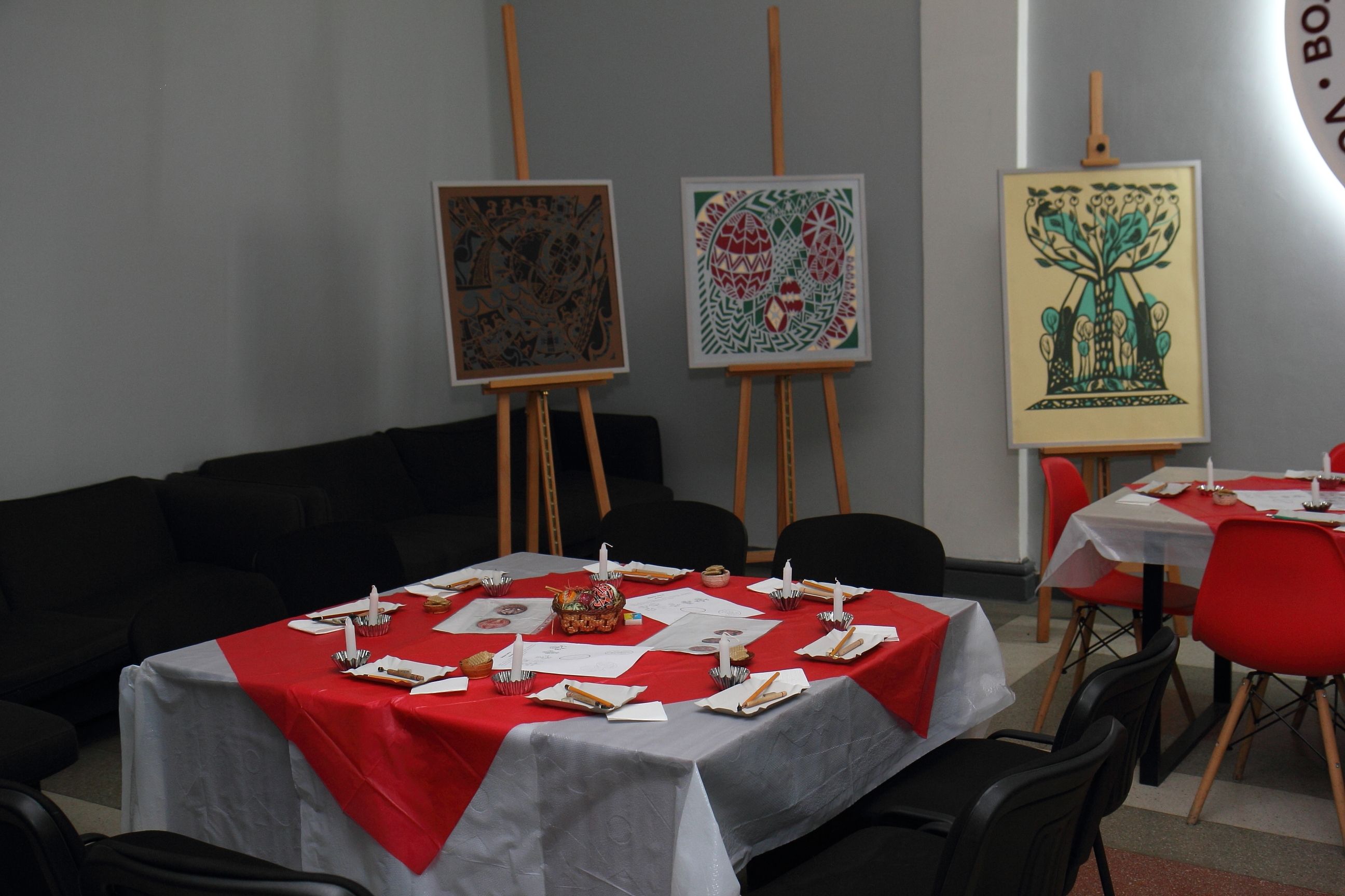 After the exhibition opening, everyone was invited to join the charity master class on Easter egg-making “Victory Easter Egg” held within the Easter Marathon. Halyna Vakhramieieva, a lecturer at Department of Fine Arts of the Faculty of Culture and Arts, guided the process and students helped the participants. The funds collected during the master class and exhibition will be donated to the Ukrainian military.