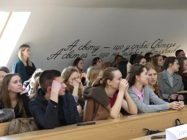 19 березня у приміщенні ФФтаЖ зібралися шанувальники української поезії. Під музичний супровід читання віршів Ліни Костенко розпочали Світлана Богдан, професорка, завідувачка кафедри історії та культури української мови, і студент Роман Царенко, який згодом, імовірно зображав музу поетки, сидячи із листом паперу і пером.