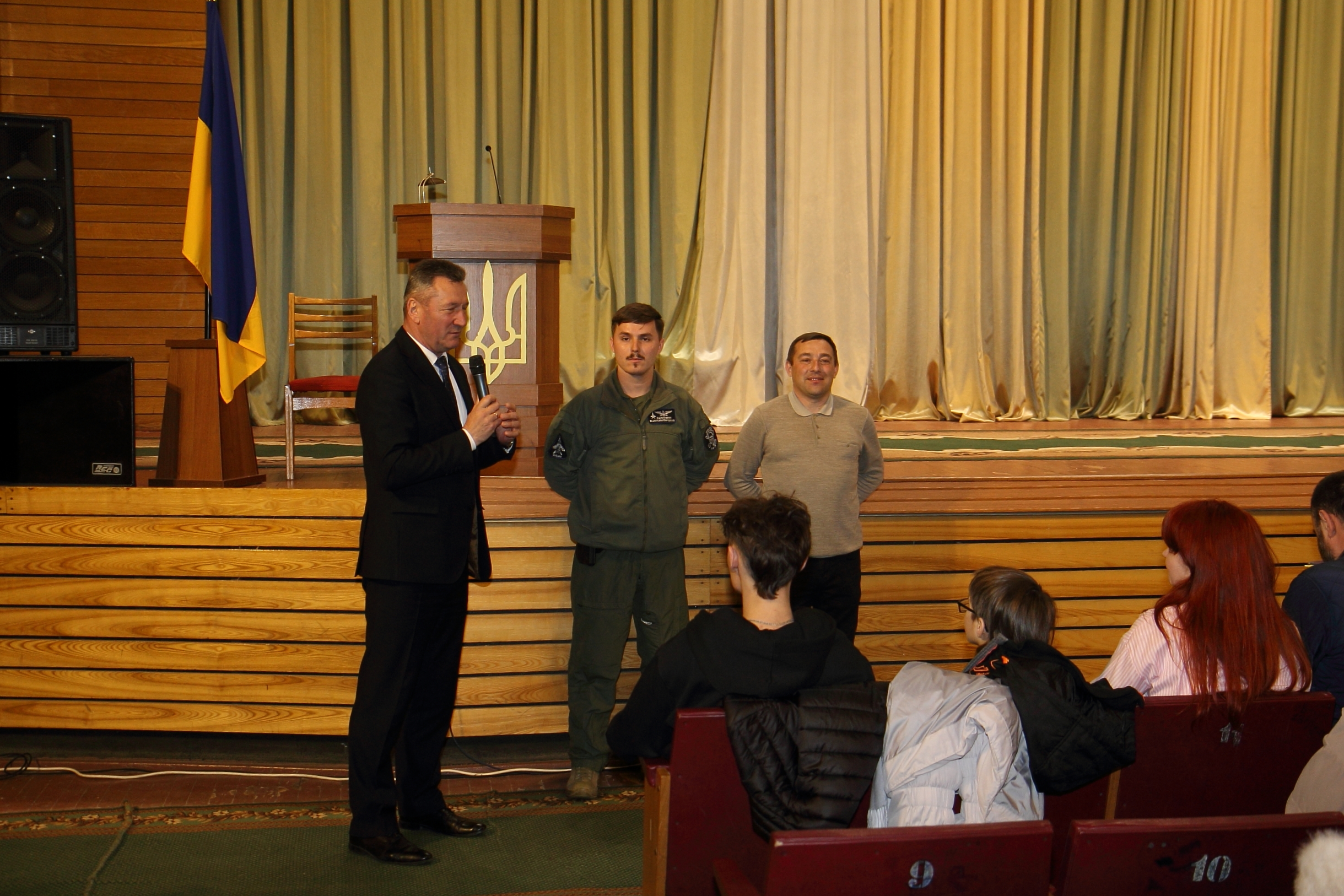 Vadym Voroshylov shared his service experience, spoke about the realities of air battles and the importance of professional training for military pilots. “I want to tell you, especially first-year students: you are the future of Ukraine. It is you who will rebuild and lead our country. Everyone in their place must do everything possible so that our children live in a free and prosperous Ukraine,” Vadym Voroshylov emphasized. Everyone could express sincere gratitude to the Hero for his service, courage, and the opportunity to share his experience.