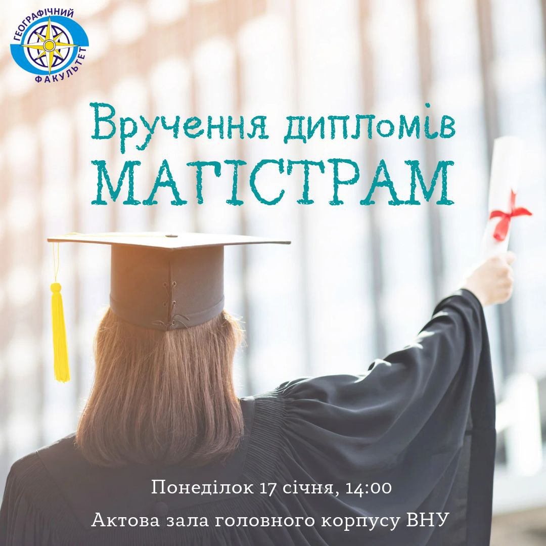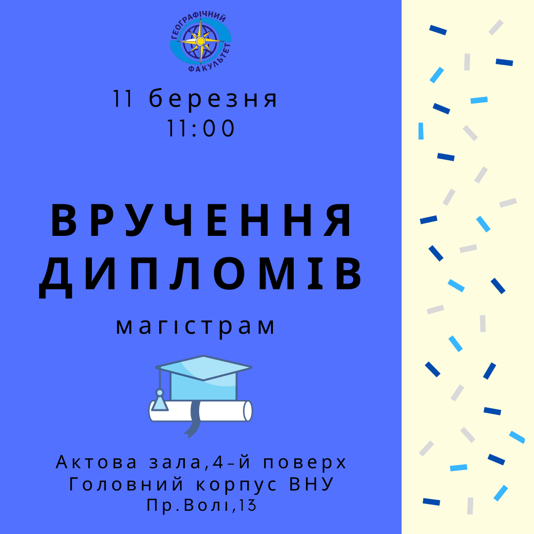 🎓Запрошуємо випускників, професорсько-викладацький склад, рідних та близьких випускників  на урочисте вручення дипломів  магістрам географічного факультету Волинський національний університет імені Лесі Українки!