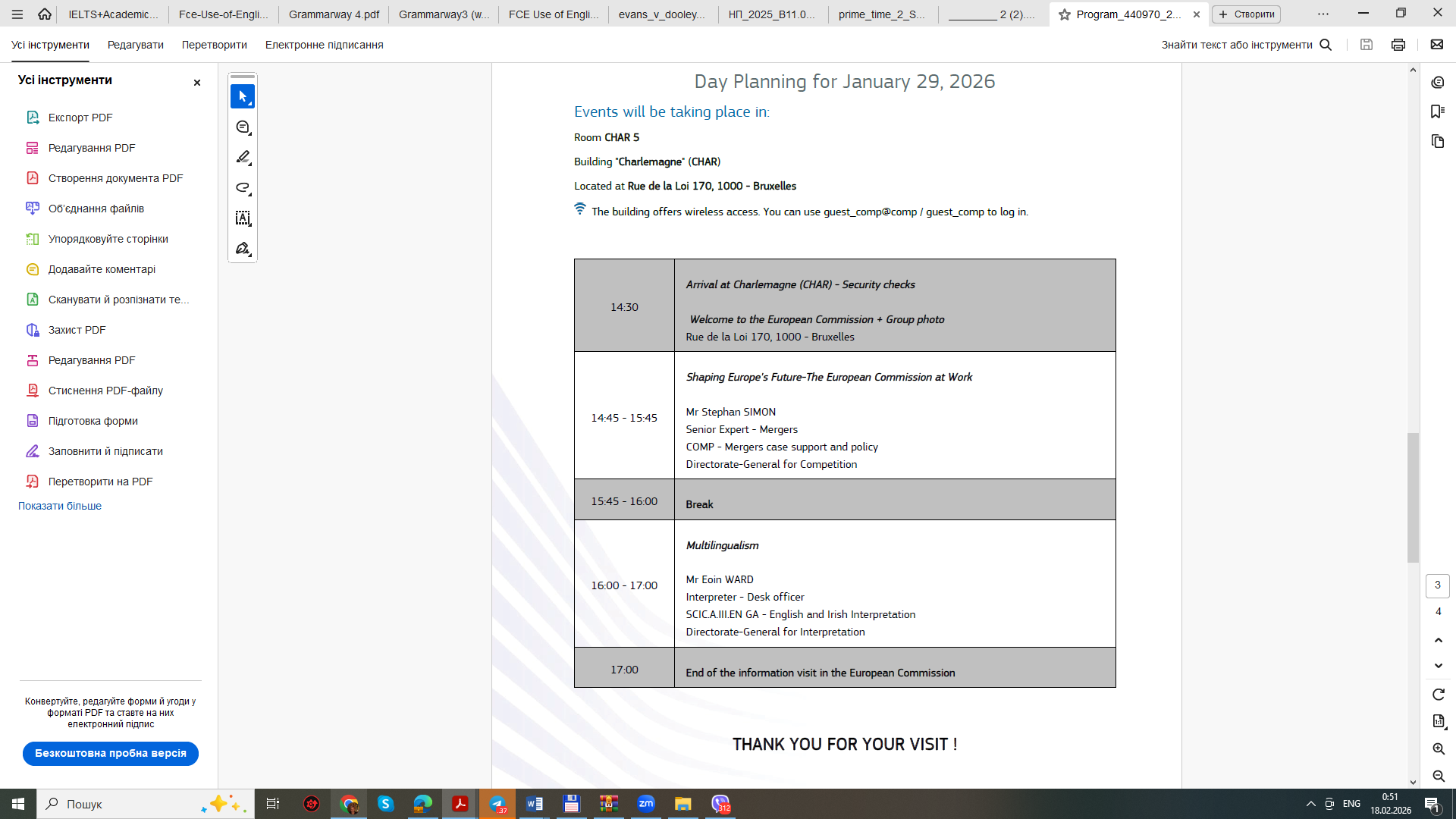 – 16:00 – 17:00 – Multilingualism section: This section was key for future interpreters. The visit coordinator, active conference interpreter, and desk officer, Owen Ward (DG SCIC), presented the work of the English and Irish interpreting department. The discussion focused not only on linguistic aspects but also on the complex logistics of ensuring multilingualism in the EU, where dozens of language combinations are used daily.