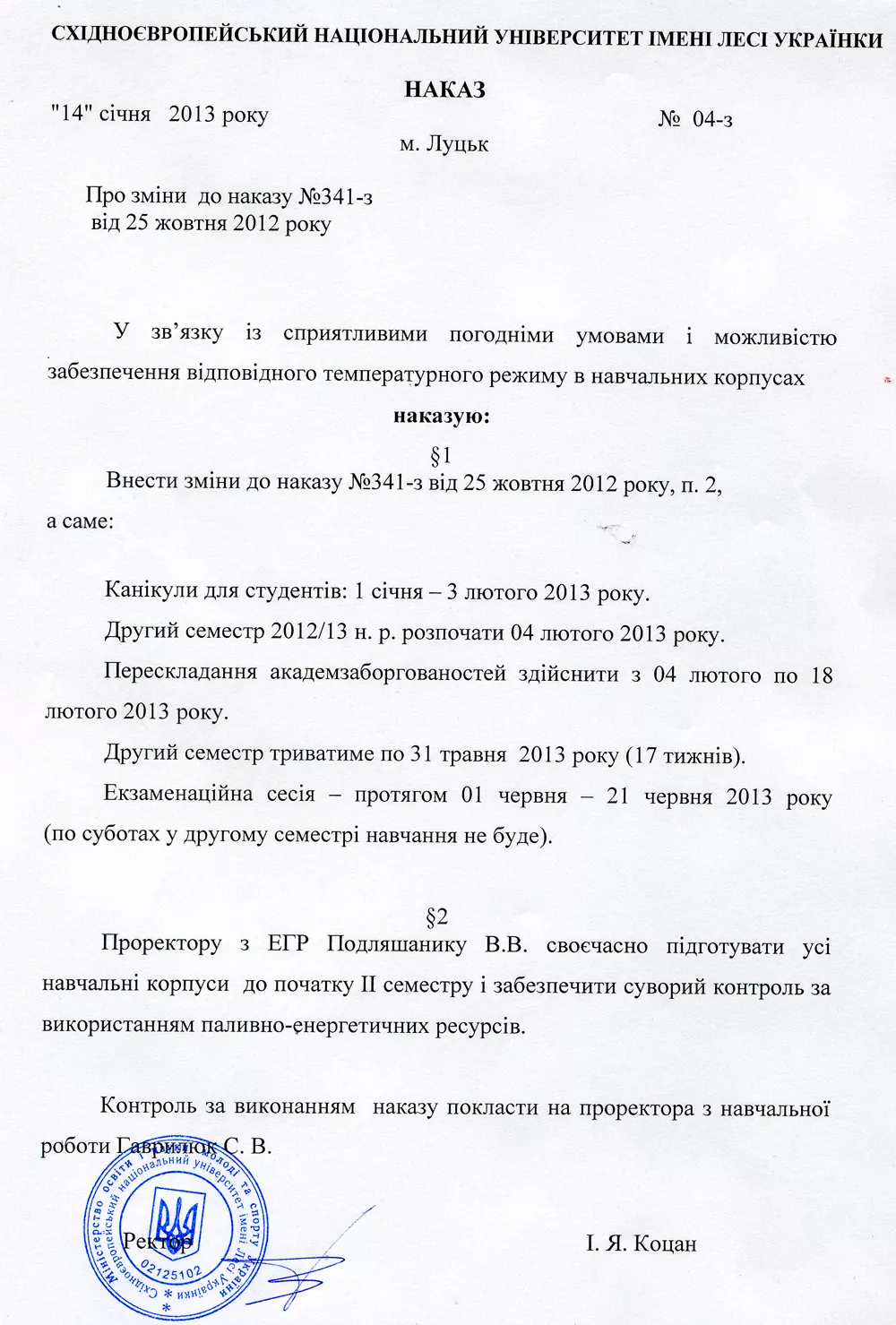 У зв'язку із сприятливими погодніми умовами і можливістю забезпечення відповідного температурного режиму в навчальних корпусах наказом ректора № 04-з від 14 січня 2013 року внесено зміни до наказу №341-з від 25 жовтня 2012 року, а саме: розпочати другий семестр 2012/2013 н. р. 04 лютого 2013 року.