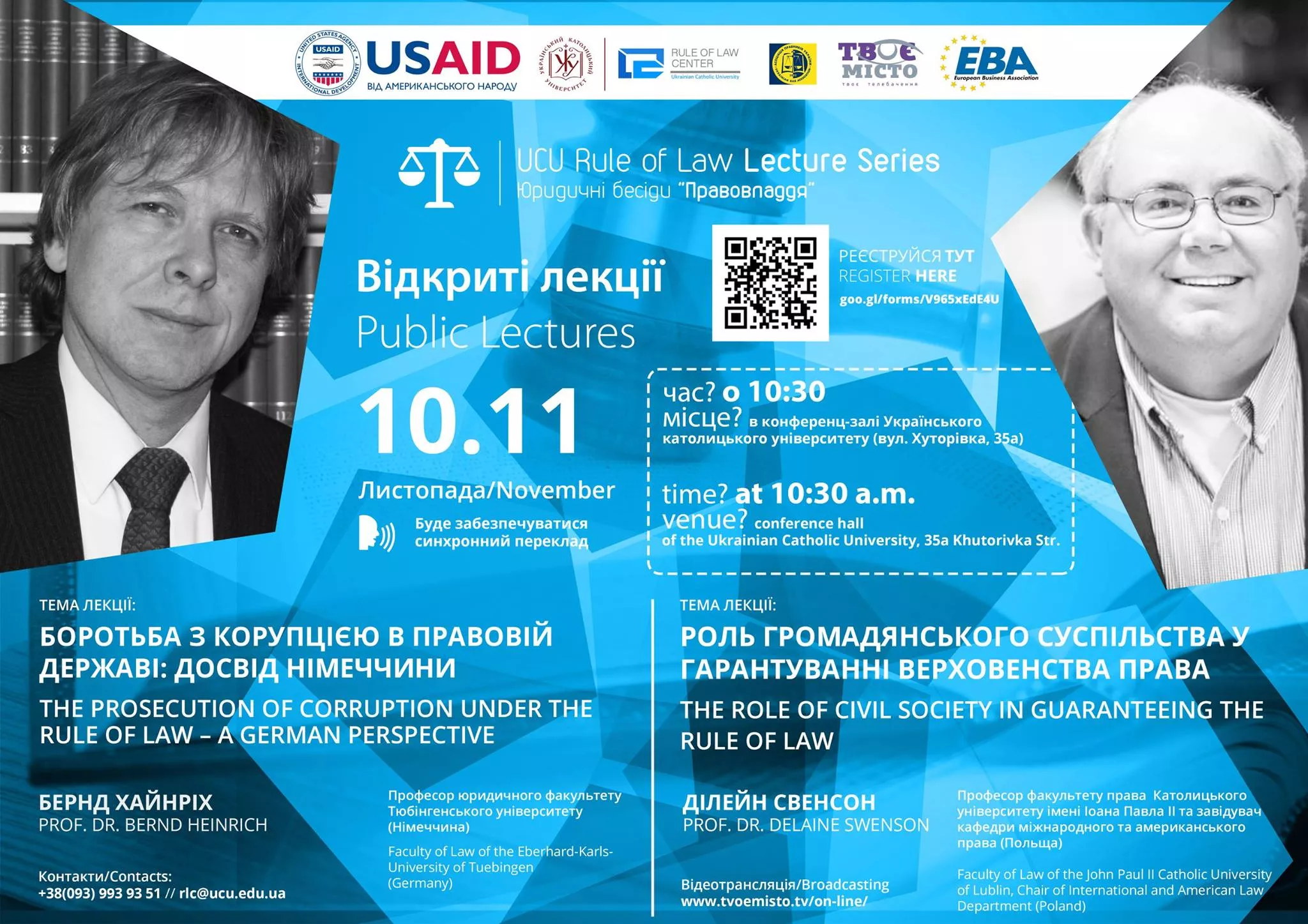 Черговий, п’ятий захід від UCU Rule of Law Lecture Series відбудеться 10 листопада (вівторок) 2015 р. о 10.30 у конференц-залі Українського католицького університету (вул. Хуторівка, 35а). В цей день відбудуться дві відкриті лекції професора права Тюбінгенського університету (Німеччина) Бернда Хайнріха (Bernd Heinrich) на тему «боротьба з корупцією в правовій державі: досвід Німеччини» та професора права Католицького університету Любліна Ділейна Свенсона на тему «Роль громадянського суспільства у гарантуванні верховенства права».