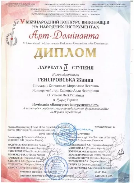 Студентка IV курсу факультету мистецтв Жанна Генсіровська (клас доцента Мирослави Сточанської) стала лауреатом V Міжнародного конкурсу виконавців на народних інструментах «Арт-Домінанта», який проходив з 5 по 9 квітня у Харківському національного педагогічному університеті імені Григорія Сковороди.
