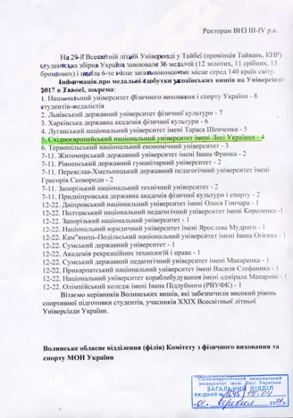 Нещодавно завершилася ХХІХ Всесвітня літня Універсіада в Тайбеї (провінція Тайвань, КНР), на якій українські студенти показали чудовий результат – 36 медалей (12 золотих, 11 срібних, 13 бронзових), 4 з яких – завоювали студенти Лесиного університету. У підсумку наша збірна посіла шосте місце серед 140 країн планети.