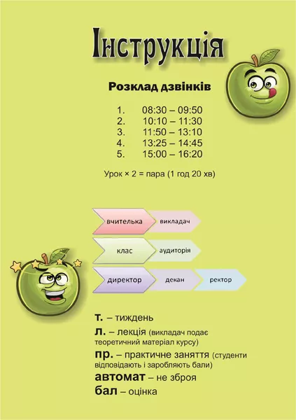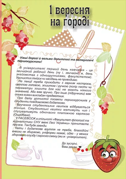Розклад перерв, розшифрування університетських скорочень, перелік спеціальностей та відповіді на традиційні запитання від наймолодших членів факультетської родини – все це вдалося вмістити в довідник. Разом із тим на сторінках журналу можна знайти інформацію про складання іспитів і заліків, систему оцінювання та розміщення кафедр.