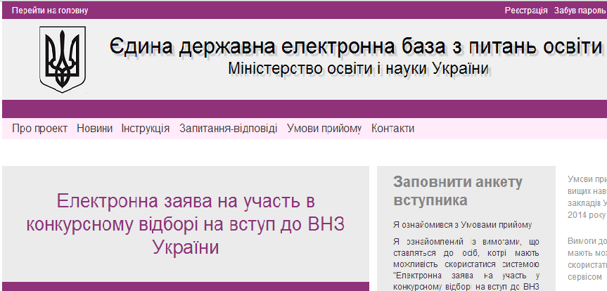 Інтернет-сайт дистанційної подачі заяв, де буде відкрито реєстрацію вступників до ВНЗ, працюватиме за адресою http://ez.osvitavsim.org.ua.