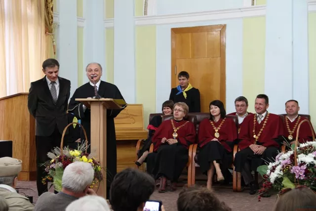 Декан біологічного факультету Андрій Поручинський зачитує представлення Еджидіо Карло Рангоне до титулу Doctor honoris causa
