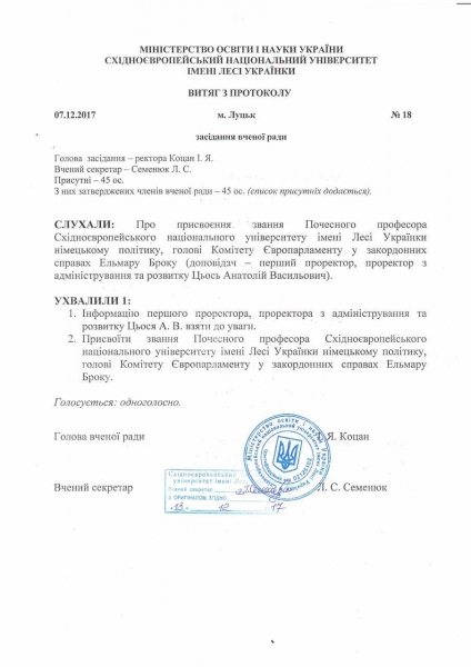 7 грудня на позачерговому засіданні вченої ради Лесиного вишу ухвалено рішення про присвоєння звання «Почесний професор Східноєвропейського національного університету імені Лесі Українки» німецькому політику, голові Комітету Європарламенту в закордонних справах, панові Елмарові Броку.