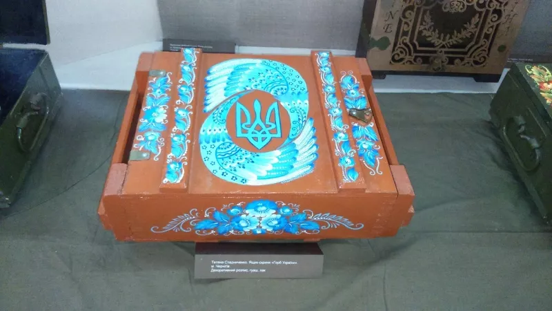 Павло Ротар (військовий із зони АТО) передавав майстрам використані коробки з-під снарядів, тканину, на яких майстри зобразили сьогодення. Деякі експонати були зроблені самими військовими. Зображення ляльки «Покрова» виготовлена з клаптиків тканини з військової форми, а протитанкова граната «Муха» розписана в петриківському стилі.