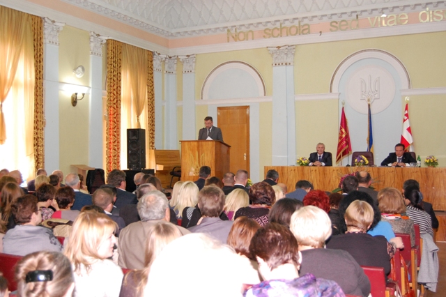 Власне Ігор Ярославович і відкрив засідання, звітуючи перед колективом про основні здобутки в таких напрямах, як науково-дослідна і навчальна робота, міжнародне співробітництво, гуманітарно-виховна сфера, покращення матеріально-технічної бази університету. Значна частина доповіді була присвячена перспективам та змінам, які будуть відбуватися в освітній галузі України з поступовим впровадженням положень нового Закону «Про вищу освіту». «Нині інтеграція України у європейський простір є спільним стратегічним напрямом як для політиків, підприємців та громадськості, так і для колективу нашого університету. Тому з пріоритетом нашої діяльності ми визначилися – це входження в єдиний європейський простір та впровадження європейських стандартів освіти», – наголосив Ігор Коцан.