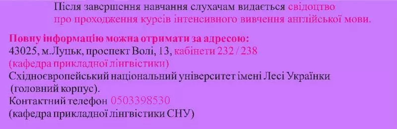 Інститут іноземної філології Східноєвропейського національного університету імені Лесі Українки проводить набір слухачів на курси інтенсивного вивчення англійської мови.