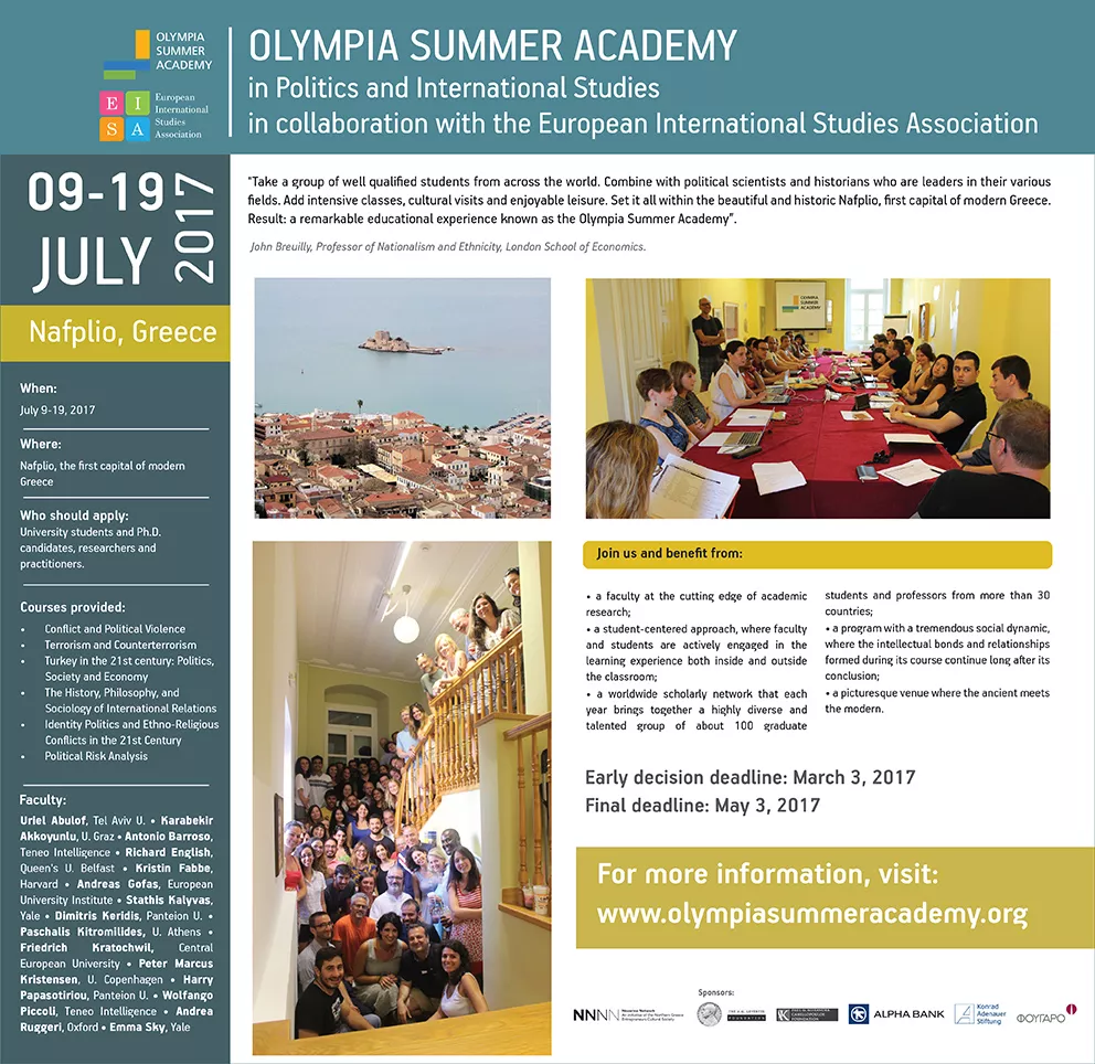 Управління міжнародного співробітництва та європейської інтеграції МОН України інформує, що Літня Академія Олімпії (Olympia Summer Academy) та Європейська Асоціація Міжнародних Досліджень (European International Studies Association) запрошує аспірантів, молодих вчених, спеціалістів-практиків до участі у серії освітніх семінарів на тему «Політика та міжнародні дослідження», які проходитимуть у період з 9 по 19 липня 2017 р. у грецькому місті Навпліо.