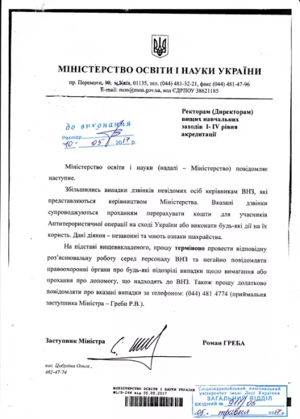 До університету надійшов лист МОН України № 911/05 від 5 травня 2017 р., у якому попереджається про збільшення випадків дзвінків від шахраїв, котрі, представляючись керівництвом міністерства, звертаються до ВНЗ із проханням перерахувати кошти учасникам АТО.