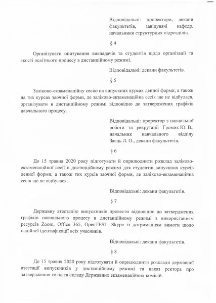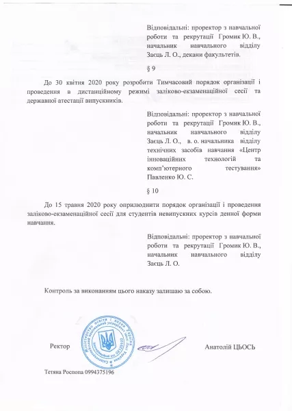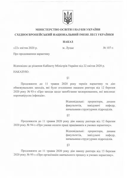 22-го квітня ректор Східноєвропейського національного університету імені Лесі Українки Анатолій Цьось підписав наказ «Про продовження карантину».
