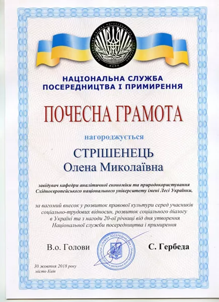 Згідно з наказом Національної служби посередництва і примирення України №74 від 29 жовтня 2018 року за вагомий внесок у розвиток правової культури серед учасників соціально-трудових відносин, розвиток соціального діалогу в Україні та з нагоди 20-ї річниці від дня утворення НСПП України Почесними грамотами відзначили завідувача кафедри аналітичної економіки та природокористування СНУ імені Лесі Українки, доктора економічних наук, професора Олену Стрішенець і доцента цієї ж кафедри, кандидата економічних наук Костянтина Павлова.