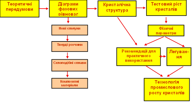 Головне завдання, яке розв’язує наукова школа професора Івана Олексеюка – це пошук нових матеріалів для різноманітних галузей напівпровідникової техніки. Мета полягає не лише в знаходженні нових речовин і дослідженні їх основних властивостей, але й у подальшій рекомендації для практичного застосування. Покроковий пошук нових матеріалів можна подати такою схемою.