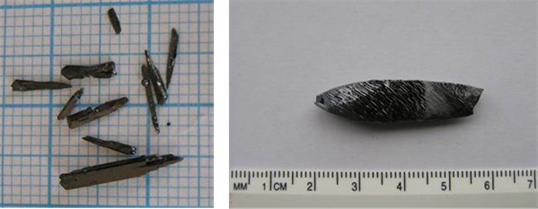 Кристали Cu2CdSiS4 (ліворуч) і Cu2CdInSe2Te2 (праворуч), одержані методами хімічних транспортних реакцій і горизонтальним варіантом методу Бріджмена-Стокбаргера, відповідно