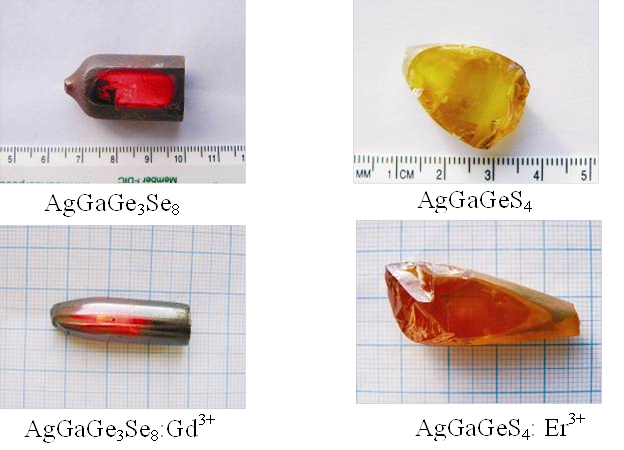Методом спрямованої кристалізації ми одержали нелеговані та леговані рідкісноземельними металами монокристали нелінійнооптичних кристалів AgGaGeS4 i AgGaGe3Se8. Ці кристали уже мають промисловий розмір. Із них можна вирізати робочі елементи об’ємом 1–2 см3. Одна з найперспективніших сфер використання кристалів AgGaGeS4, AgGaGe3Se8 –  параметричні генератори світла. Це новий клас нелінійно-оптичних матеріалів, які здатні перетворювати світло з ІЧ-області у видиму. Промислового розміру одержані кристали та низка галогенідних кристалів Cs2HgCl4, Cs2HgBr4, TlBr, PbI2, Tl4HgI6 i Tl3PbCl5 також перспективні для використання в нелінійній оптиці й акустооптиці.