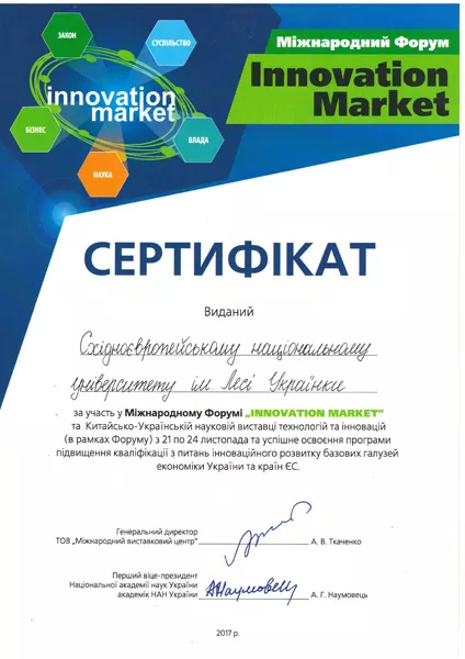 21–24 листопада 2017 року науковці університету і працівники науково-дослідної частини на чолі з проректором з наукової роботи та інновацій взяли участь у роботі ІІ Міжнародного форуму «Innovation Market», який відбувався на базі Міжнародного виставкового центру (м. Київ).