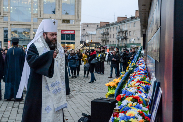 До оновленого фотостенду «Герої Небесної сотні та загиблі за єдність України» помолитися за воїнів, полеглих за незалежність країни прийшли ветерани АТО, волонтери, родичі загиблих, представники влади, духовенства, культури й освіти, лучани, гості обласного центру.