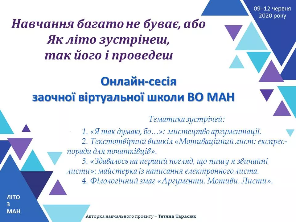 Секція української мови онлайн-сесії заочної віртуальної школи ВО МАН була чи не найчисельнішою: 24 учні 8–10 класів закладів середньої освіти Волинської області вирішили скористатися народною мудрістю і розпочати літо інтерактивно. Чотири дні (з 9 до 12 червня) у товаристві моволюбів, коли кожне наступне заняття продовжує попереднє, а всі разом об’єднані темою листовного діалогу. Розпочавши з навчання мистецтву аргументації та перевіривши здобутті знання в тестовому форматі, учасники пройшли текстотвірний вишкіл «Мотиваційний лист: експрес-поради для початківців». Саме умінь писати короткі тексти, що відображають особистісні цінності учасника та його зацікавленість у певному проєкті, вимагає від сучасників сьогодення. Майстерка з написання електронного листа «Здавалося на перший погляд, що пишу я звичайні листи» засвідчила вправність школярів спілкуватися посередництвом ділової кореспонденції в електронному форматі. За умовами філологічного змагу «Аргументи. Мотиви. Листи» учням потрібно було написати мотиваційного листа, в якому переконливо розповісти про своє бажання навчатись у МАН й очікування від такої діяльності. Аргументи були промовисті. У кожному слові простежувалася виваженість вибору, відповідальність за себе, бажання саморозвитку та самовизначення. І безкінечний потік позитивних емоцій.
