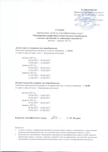 Анотація курсу: забезпечення належного рівня знань спеціалістів, відповідальних за організацію та проведення публічних закупівель (далі − закупівлі), достатнього для кваліфікованого здійснення процедур закупівель відповідно до вимог законодавства; формування системи спеціальних знань із питань організації й функціонування системи публічних закупівель, правового регулювання та інформаційного забезпечення закупівель, планування, організації і здійснення процедур закупівель, управління контрактами, оскарження закупівель, державного контролю та відповідальності у сфері публічних закупівель; набуття вмінь та навичок із питань здійснення процедур закупівель, застосовування законодавства та використання електронної системи закупівель під час проведення процедур закупівель, розроблення необхідної документації для організації та здійснення закупівель. Навчання проводиться у співпраці з ГО «Центр АСНДІ» відповідно до Меморандуму про напрями співпраці щодо вдосконалення професійної підготовки з питань публічних закупівель від 24.05.2016 р. №19У.