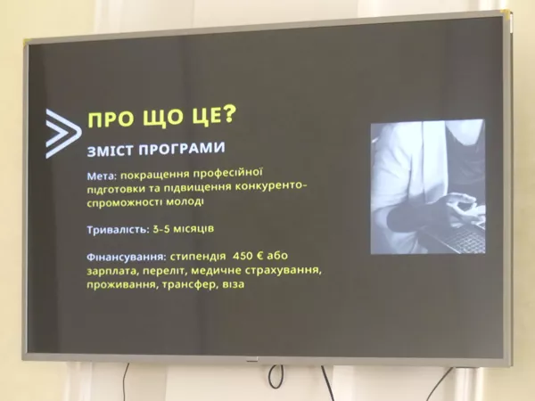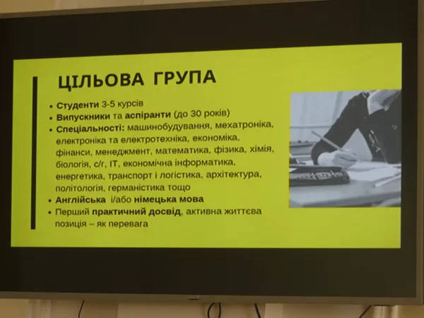 15 квітня в Східноєвропейському національному університеті імені Лесі Українки відбулася презентація німецької стипендіальної програми від Торгово-промислової палати України, на яку завітали студенти факультету іноземної філології. Програма фінансується Федеральним міністерством економічного співробітництва та розвитку (BMZ) й упроваджується за підтримки Торгово-промислової палати України та Німецького товариства економічного співробітництва (GIZ GmbH). Презентував програму координатор проекту Андрій Гончарук.