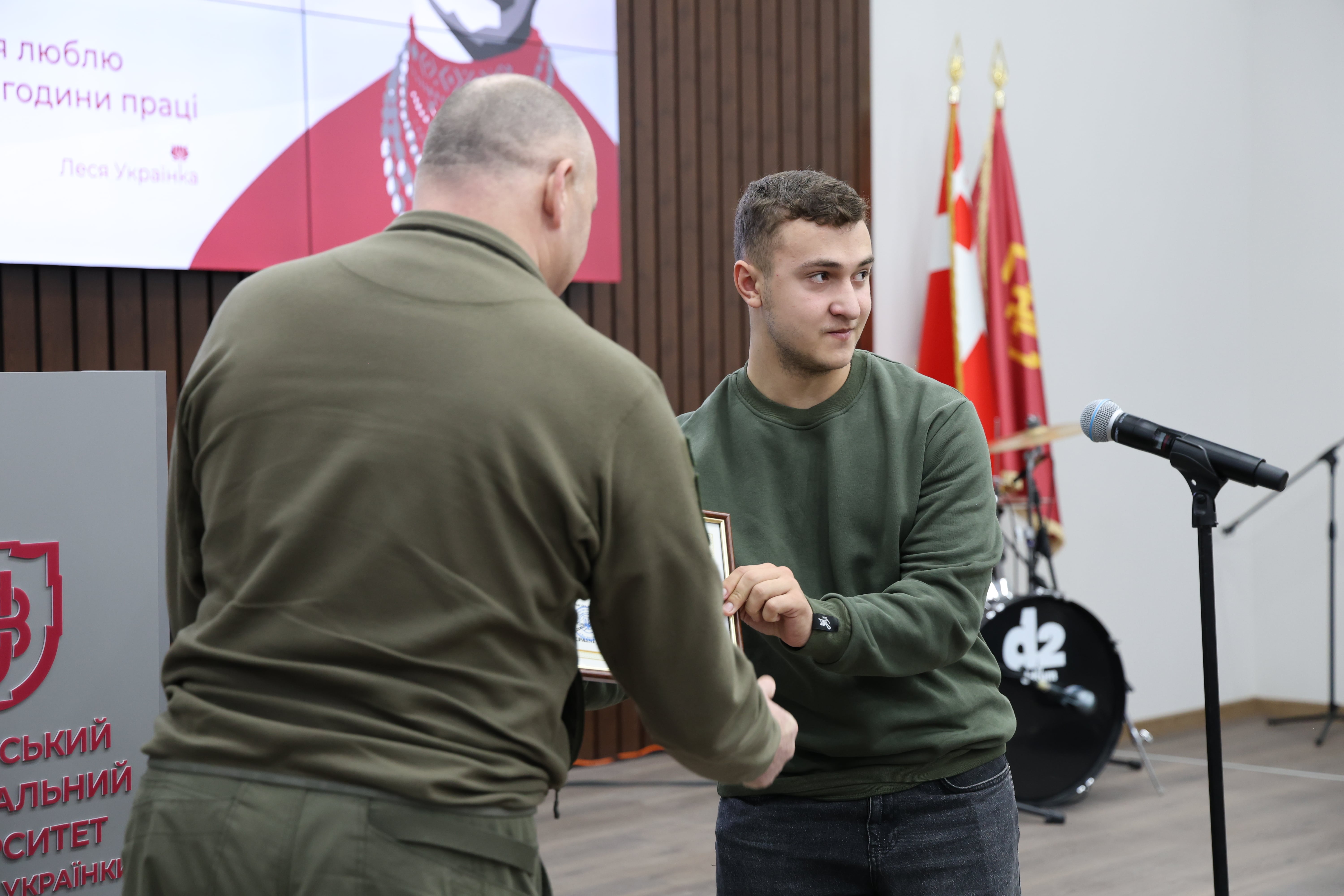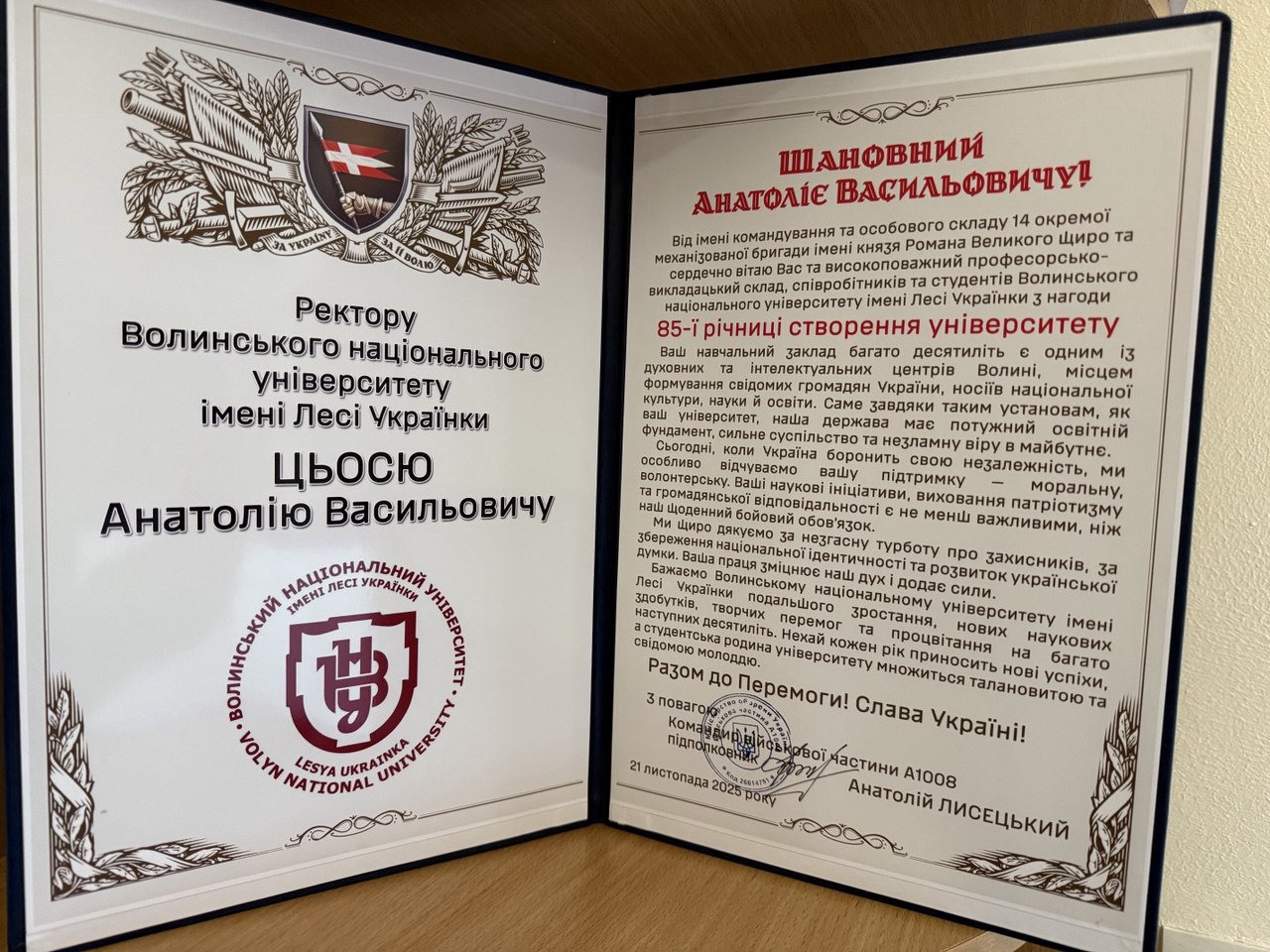 «Ми дякуємо вам за те, що ви виховуєте не просто розумних, а свідомих людей. За викладачів, які вчили не боятися думати, за студентів, які не звикли мовчати, і за те, що дух Лесі Українки не в цитатах на фасаді, а у вашій сміливості залишатися українським університетом навіть тоді, коли світ хиткий. Ми бажаємо вам тримати цей рівень, не ховатися у комфорті, а продовжувати бути місцем, де формується країна», – зазначили у відеозверненні до університетської спільноти бійці 100-ї механізованої бригади.