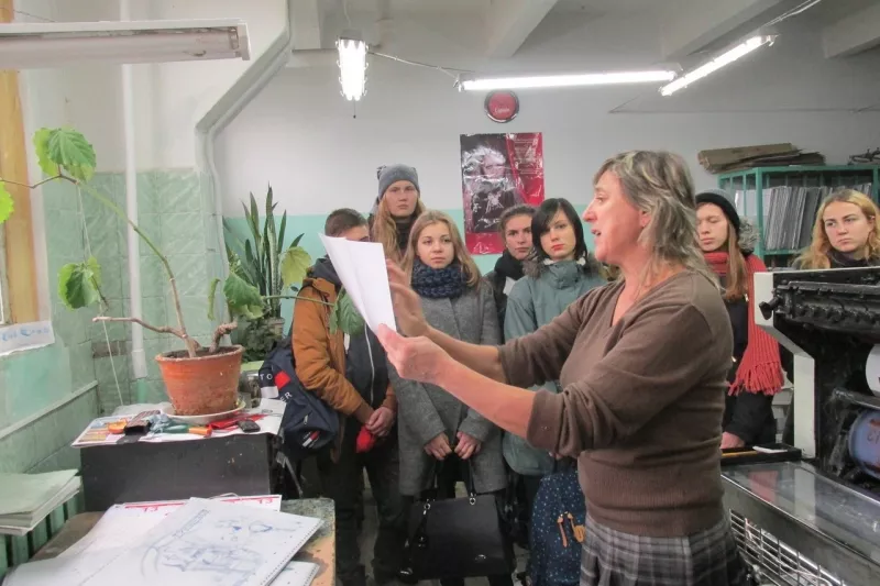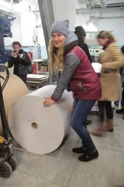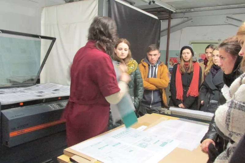 Наступна не менш цікава локація, до якої попрямували майбутні редактори, – Волинська обласна друкарня. Цей візит не лишив байдужим нікого, адже ми дізналися, як «народжуються» газети та книги, побачили унікальні видання шрифтом Брайля. Видавці по-новому із практичного боку подивилися на всю «кухню» поліграфії. Пізнавальні відомості про редакційно-видавничий процес акули пера отримали від завідувача виробництва Лілії Борсук, редактора Анни Трофимчук та працівників відділів додрукарської та виробничої підготовки, за що їм велике спасибі.