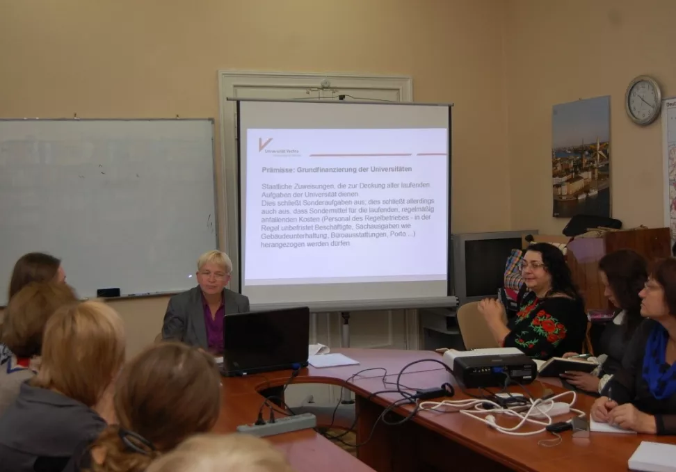 Гостя з Німеччини розповіла волинським колегам, звідки їхній університет отримує фінансування і як розпоряджається цими коштами. Для прикладу Маріон Рікен навела ось таке: «В нас є державна програма, яка фінансує дослідження, зокрема науку. В Німеччині спостерігається старіння населення, тобто зростає чисельність людей пенсійного віку. І якщо ми подамо заявку на дослідження цієї теми, то, можливо, отримаємо на це фінансування від держави». Ще одним важливим моментом може стати онлайн-навчання, але для цього необхідно гроші на покращення інфраструктури.