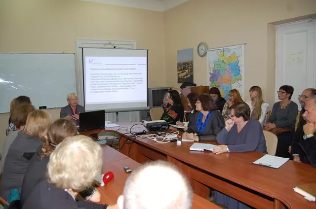 Нагадаємо, що впродовж трьох днів (16–18 вересня) у Лесиному виші перебувала делегація з університету Фехта на чолі з доктором Маріон Рікен. За участю гостей проходили воркшопи, які мали на меті ввести і теоретично обумовити проектоорієнтоване навчання/проблемнобазоване навчання (POPBL) як актуальну форму навчання й учіння для сприяння вищепоставлених цілей Болонського процесу – employability (здатність працевлаштування) та особливо citizenship (активна громадянська позиція) – на основі власного досвіду в університеті Фехта (реферат-імпульс університет Фехта), разом обговорити теоретичне впровадження та розвинути ці дидактичні прийоми в університеті Фехта.