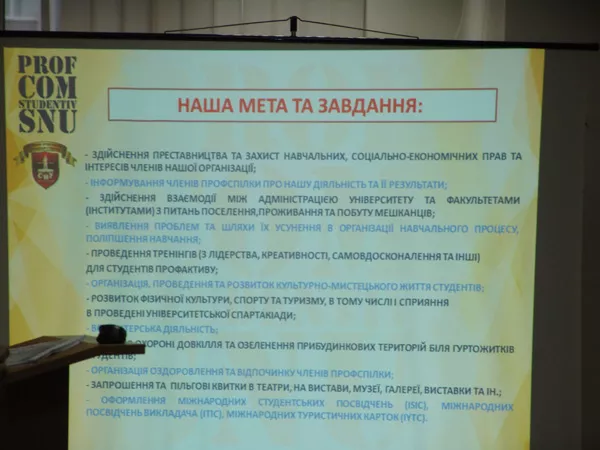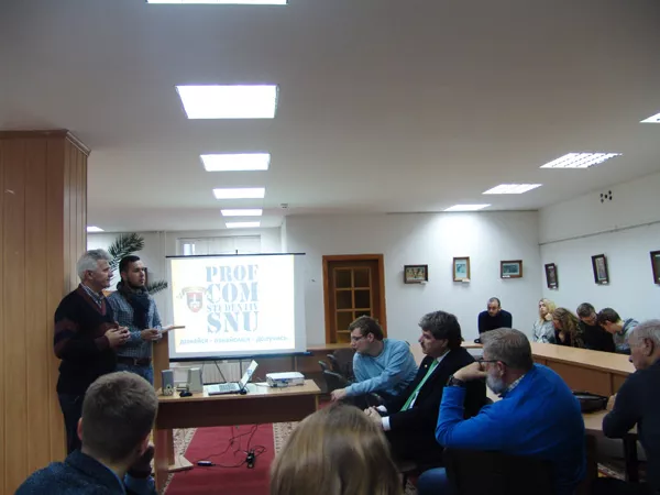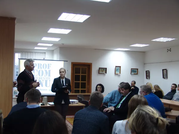 Вадим Курилюк розповів про засади функціонування профкому студентів, різноманітні культурні заходи, які організовує молодь власними зусиллями – Віденський бал, «Ніч у бібліотеці», «Просто посиденьки» й інше. Навів приклади, як активно відстоює свої права студентство й у відносинах з адміністрацією університету: умови проживання в гуртожитках, навчальне навантаження, хабарництво, плата за навчання та проживання в гуртожитках. Під час виступів від гостей з Німеччини лунало безліч запитань, що стосувалися як джерел фінансування, так і способу життя студентства.