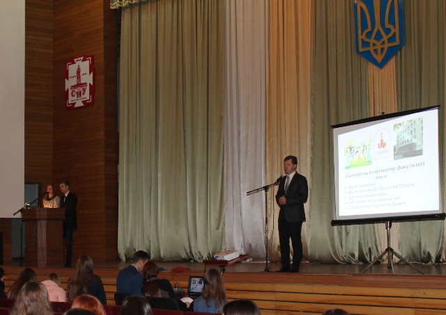 З вітальним словом виступив декан факультету, доктор історичних наук, доцент Анатолій Шваб. Він розповів про те, що сьогодні на факультеті здійснюється підготовка спеціалістів за такими спеціальностями: «Історія», «Політологія», «Документознавство та інформаційна діяльність», «Музейна справа та охорона пам'яток історії та культури», «Управління інформаційною безпекою», «Державна служба». У 2016 році планується відкриття нової перспективної спеціальності «Державна безпека».