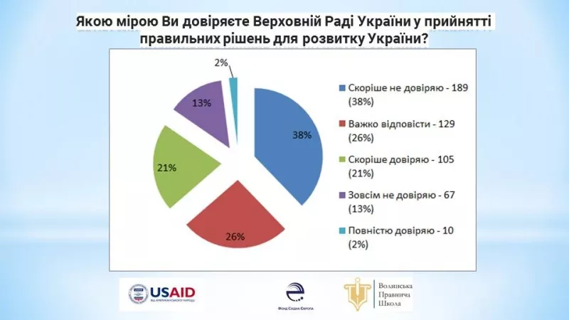 Великий відсоток опитаних висловили недовіру Верховній Раді України. «Скоріше не довіряють» 38 % респондентів, «скоріше довіряють» – 21 %. «Повністю довіряють» лише 2 % опитаних, а «зовсім не довіряють» – 13 %. 129 (26 %) молодих людей не змогли дати відповідь на це питання, обравши варіант «важко відповісти».