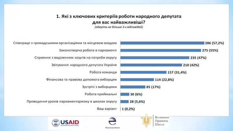Більшість опитаних (57,2 %) вважають, що найважливіший критерій роботи народного депутата – «Співпраця з громадськими організаціями та місцевою владою». Оскільки можна було обирати декілька критеріїв, то 55 % респондентів вказали і законотворчу роботу в Парламенті. Важливими критеріями роботи народного депутата молодь відзначила: «Сприяння виділенню коштів на потреби округу» (47 %), «Звітування народного депутата України» (42 %). Найменше були виділені «Робота приймальні» (6 %) та «Проведення уроків парламентаризму в школах округу» (5,6 %). Це можна пояснити тим, що у цьому питанні обирали не більше як три відповіді. Тому молодь вказала найважливішими згадані вище критерії. Один респондент, обираючи відповідь «Ваш варіант», зазначив, що «ніякий варіант не важливий» (0,2 %).