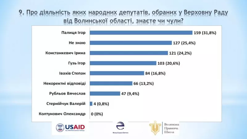 Найпопулярніший серед молоді Ігор Палиця (31,8 %). Про роботу Ірини Констанкевич відомо 24,4 % респондентів. 20,6 % опитаних обрали варіант відповіді «Ігор Гузь», 16,8 % – «Степан Івахів». Лише 0,8 % респондентів знають про діяльність Валерія Стернійчука. Жоден опитаний не вказав нардепа Олександра Колтуновича.