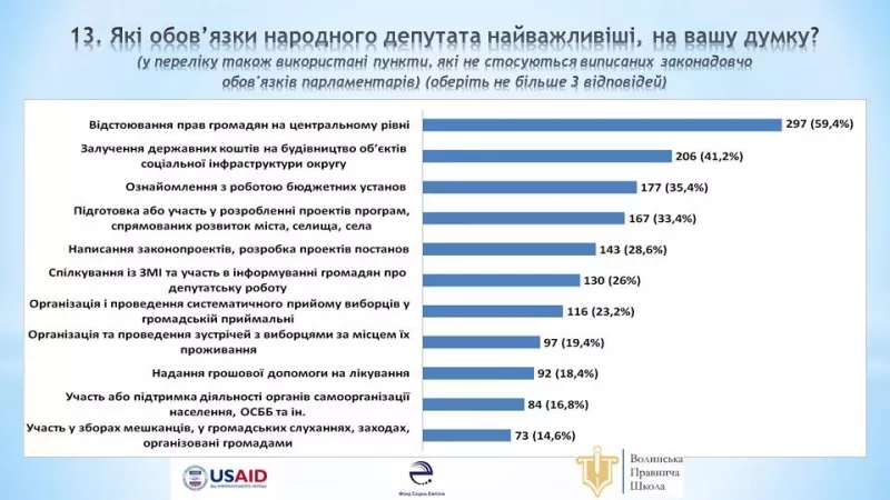 Майже усі опитані (95,4 %) вважають, що найважливіший обов’язок народного депутата – «Відстоювання прав громадян на центральному рівні». 41,2 % респондентів обрали «Залучення державних коштів на будівництво об’єктів соціальної інфраструктури округу (шкіл, дитсадків, лікарень, ремонт доріг, облаштування вуличного освітлення та ін.)». «Ознайомлення з роботою бюджетних установ (школи, дошкільні заклади та заклади позашкільної освіти, охорони здоров’я, соціального захисту) та вивчення проблемних питань» – пріоритетна робота народного депутата для 35,4 % опитаних. 16,8 % молоді відзначили варіант «Участь або підтримка діяльності органів самоорганізації населення, ОСББ та громадських і благодійних організацій і фондів», 14,6 % – «Участь у зборах мешканців, громадських слуханнях, заходах, організованих громадами».