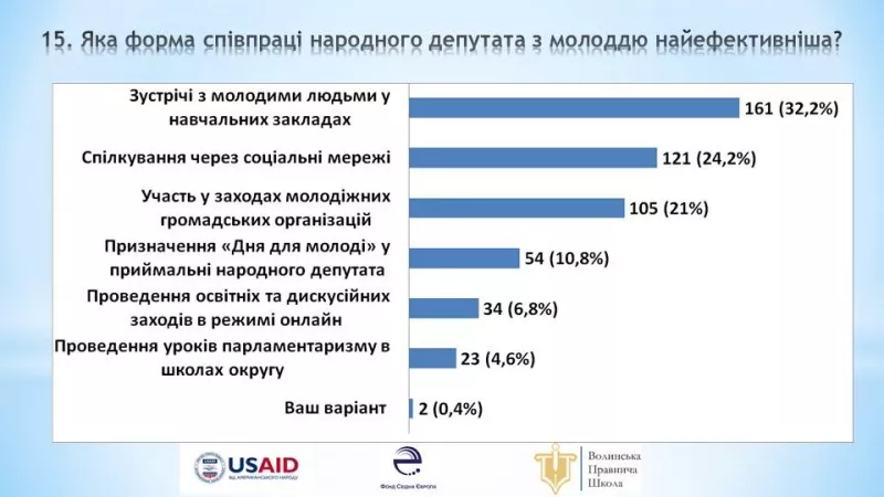32 % респондентів вважають, що співробітництво з молоддю найефективніше під час зустрічі у навчальних закладах. 24 % опитаних обрали «Спілкування через соціальні мережі». «Участь у заходах молодіжних громадських організацій» – найефективніша форма співпраці для 21 % респондентів. 11 % хотіли б «Призначення Дня для молоді у приймальні народного депутата». «Проведення й участь в освітніх і дискусійних заходах в режимі онлайн» підтримало 7 % опитаних. Лише 5 % молоді віддали перевагу урокам парламентаризму в школах округу. Обираючи «Ваш варіант», респонденти зазначили: «За кожної потреби громадянина», «Щодня».