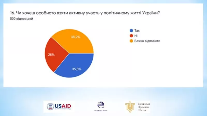 38,2 % респондентів сумнівалися і не знали, чи хочуть вони долучитися до політичного життя України. 35,8 % молоді висловили бажання взяти активну участь у політичному житті країни. 26 % не хочуть брати участь у політичних заходах.