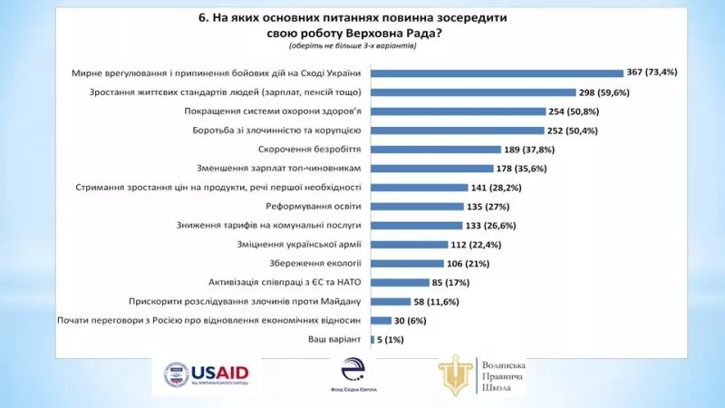 Пріоритет роботи Верховної Ради, на думку 73,4 % опитаних, – це «мирне врегулювання і припинення бойових дій на Сході України». Це питання турбує 367 респондентів. Серед пріоритетів 59,6 % молоді зазначила «Зростання життєвих стандартів людей (зарплат, пенсій тощо)». 50,8 % опитаних обрали «Покращення системи охорони здоров’я», 50,4 % – «Боротьба зі злочинністю та корупцією», 37,8 % – «Скорочення безробіття», 35,6 % –«Зменшення зарплат топ-чиновникам», 28,2 % – «Стримання зростання цін на продукти, речі першої потреби», 27 % – «Реформування освіти», 26,6 % – «Зниження тарифів на комунальні послуги», 22,4 % – «Зміцнення української армії», 21 % – «Збереження екології». На думку молоді, найменше Верховна Рада зосереджена на таких питаннях, як-от: «Активізація співпраці з ЄС та НАТО» (17 %), «Прискорення розслідування злочинів проти Майдану» (11,6 %), «Почати переговори з Росією про відновлення економічних відносин» (6 %). Обравши відповідь «Ваш варіант», респонденти зазначали: «Економічні реформи та лібералізація», «Усі варіанти важливі».