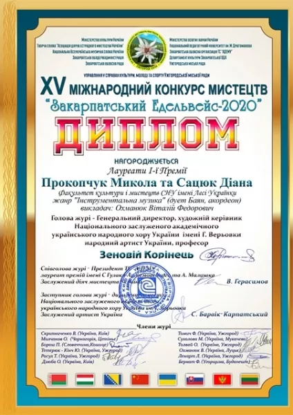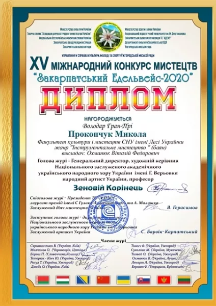 Колектив факультету культури і мистецтв щиро вітає студента ІІ курсу спеціальності «Музичне мистецтво» Миколу Прокопчука та його викладача, кандидата мистецтвознавства, доцента кафедри музично-практичної підготовки Віталія Охманюка з упевненою і достойною перемогою (Гран-прі) у ХV Міжнародному конкурсі-фестивалі мистецтв «Закарпатський Едельвейс–2020» у номінації «Інструментальне мистецтво – баян», що відбувся 30 квітня – 2 травня у місті Ужгороді.