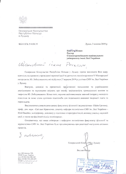 У листі зазначено: «Генеральне консульство Республіки Польща у Луцьку прагне висловити Вам щиру вдячність за сприяння у проведенні наукової сесії й урочистих заходів вручення V Міжнародної нагороди ім. Ю. Лободовського, які відбулися 27 вересня 2019 р. у стінах СНУ ім. Лесі Українки у Луцьку.