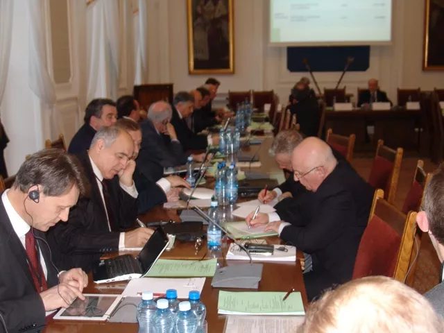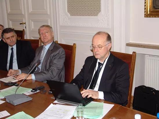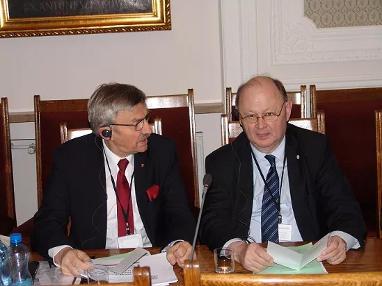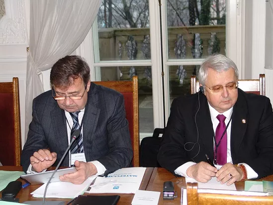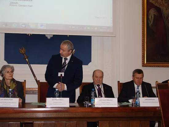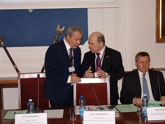 На фото (зліва направо): віце-президент Конференції ректорів Німеччини Джоана-Елеонора Вебер, президент Конференції ректорів академічних шкіл Польщі Веслав Банись, президент Спілки ректорів України, ректор Київського національного університету імені Тараса Шевченка Леонід Губерський, Посол України в Польщі Андрій Дещиця