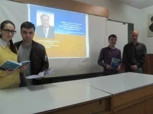 На початку презентації учні Георгія Євлампійовича – декан фізичного факультету, доктор фізико-математичних наук Сергій Федосов і заступник декана з науково-дослідної роботи, доцент кафедри ФТТ та ІВТ, кандидат фізико-математичних наук Галина Мирончук – коротко розповіли біографію автора та показали фільм «Пам’яті Георгія Давидюка».