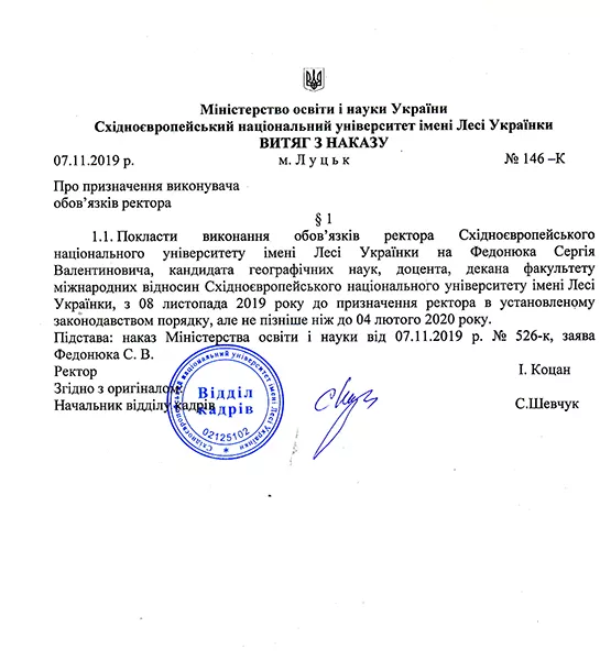 Згідно з наказом Міністерства освіти і науки України від 07.11.2019 р. № 526-к із 08 листопада 2019 року виконувачем обов’язків ректора Східноєвропейського національного університету імені Лесі Українки призначено кандидата географічних наук, доцента, декана факультету міжнародних відносин СНУ Сергія Федонюка. Сергій Валентинович виконуватиме обов’язки ректора вишу до призначення ректора в установленому законодавством порядку, але не пізніше ніж до 04 лютого 2020 року.