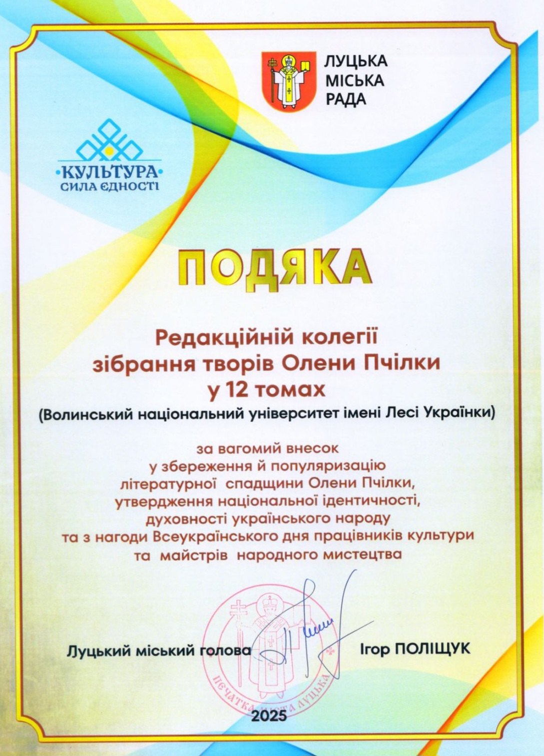Редакційну колегію зібрання творів Олени Пчілки у 12 томах відзначено Подякою Луцького міського голови