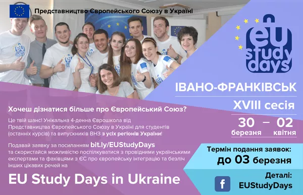 Представництво Європейського Союзу в Україні у співпраці з Українським освітнім центром реформ запрошує взяти участь у XVIII сесії Єврошколи (EU Study Days), яка відбудеться 30 березня – 2 квітня 2017 року в Івано-Франківську.